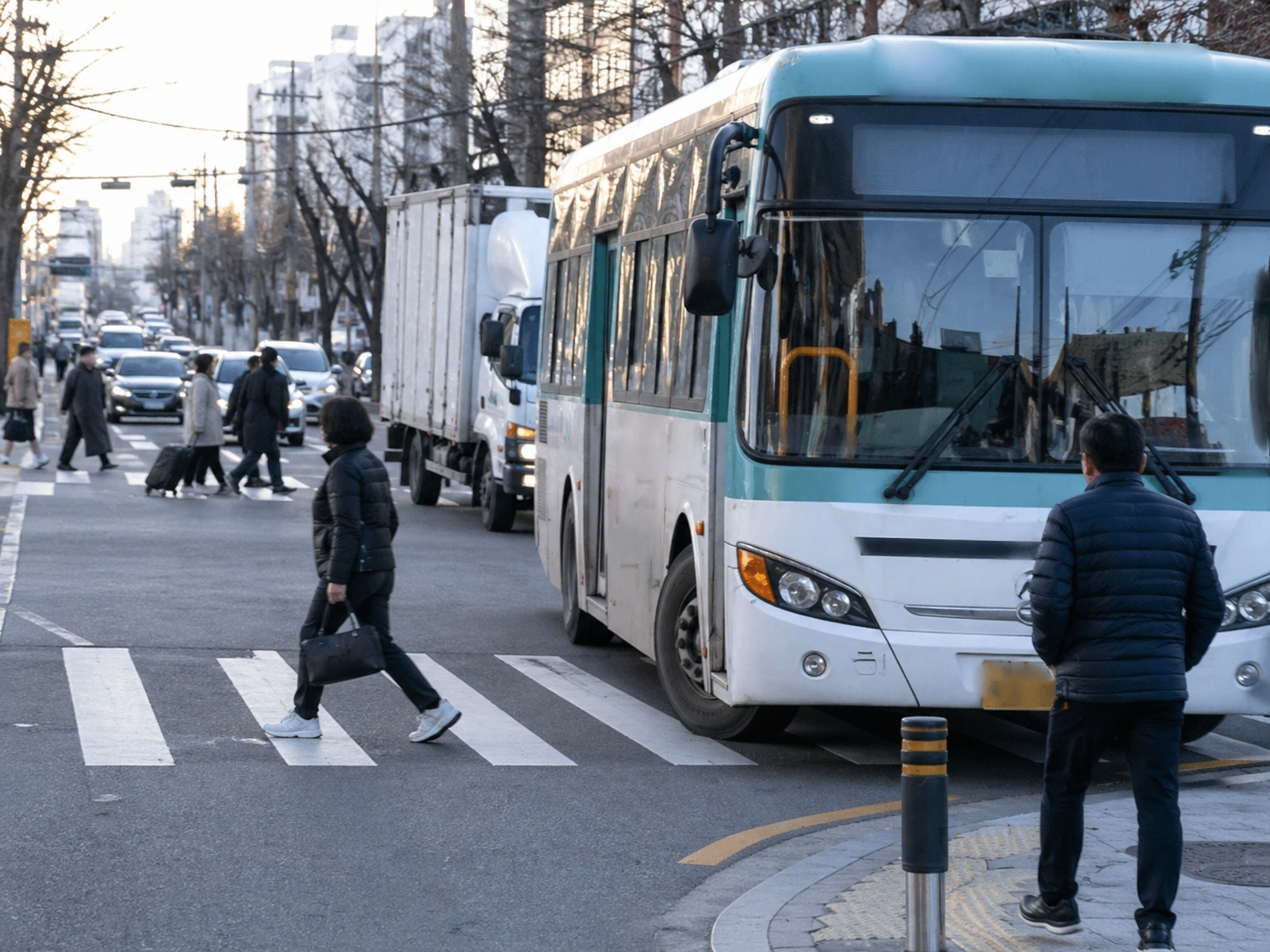 특히 버스, 화물차, 대형 SUV처럼 차체가 큰 차량은 우회전 시 보행자가 더 잘 보이지 않을 수 있습니다.