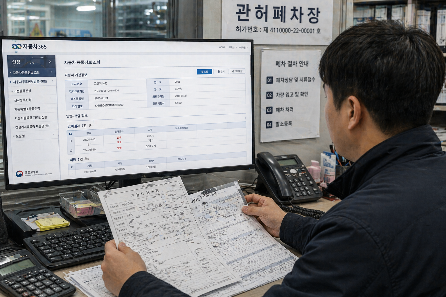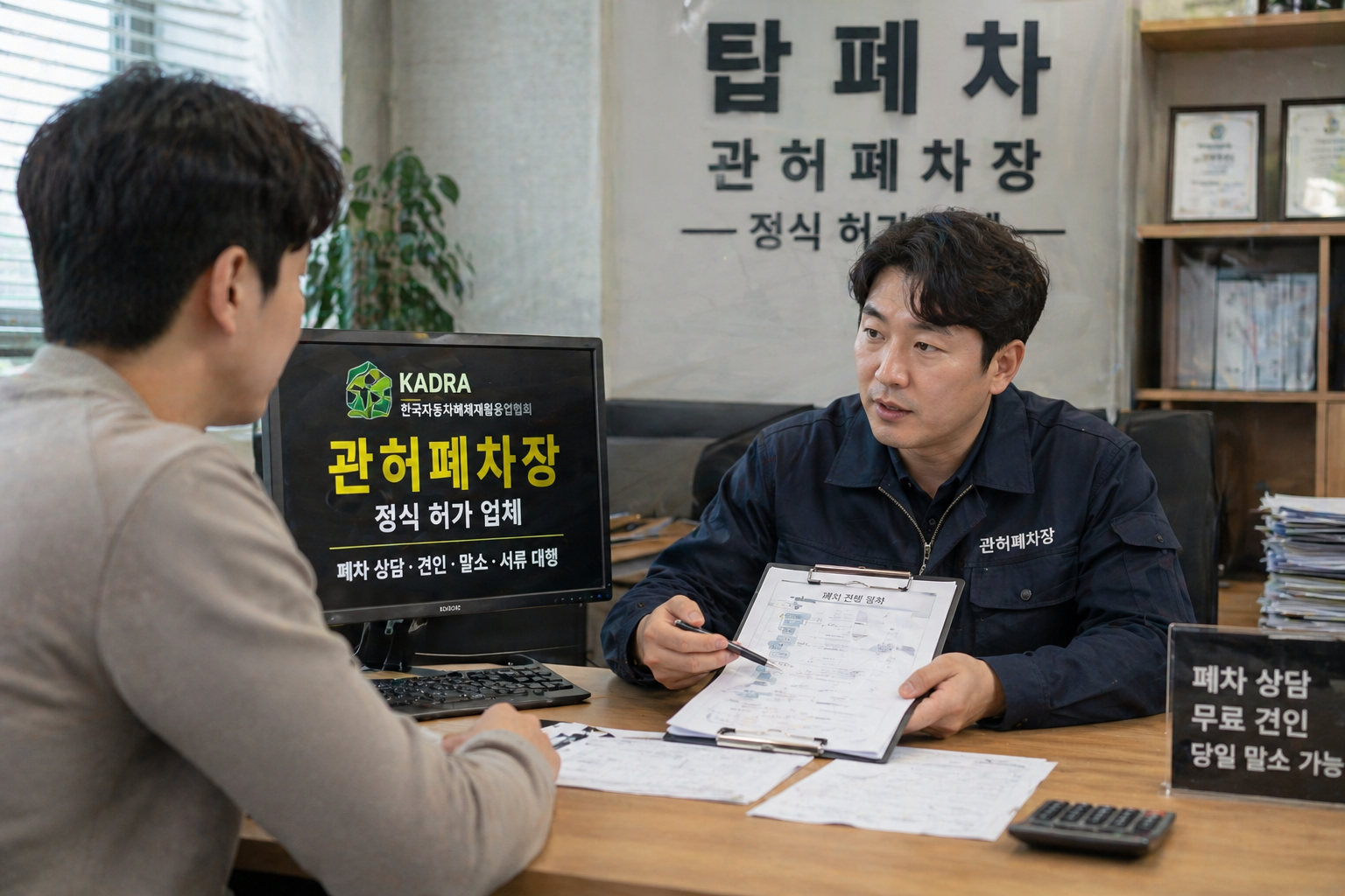 관허폐차장은 폐차인수증명서 발급과 정상적인 말소 처리가 가능하며, 행정 절차까지 모두 대행된다.
