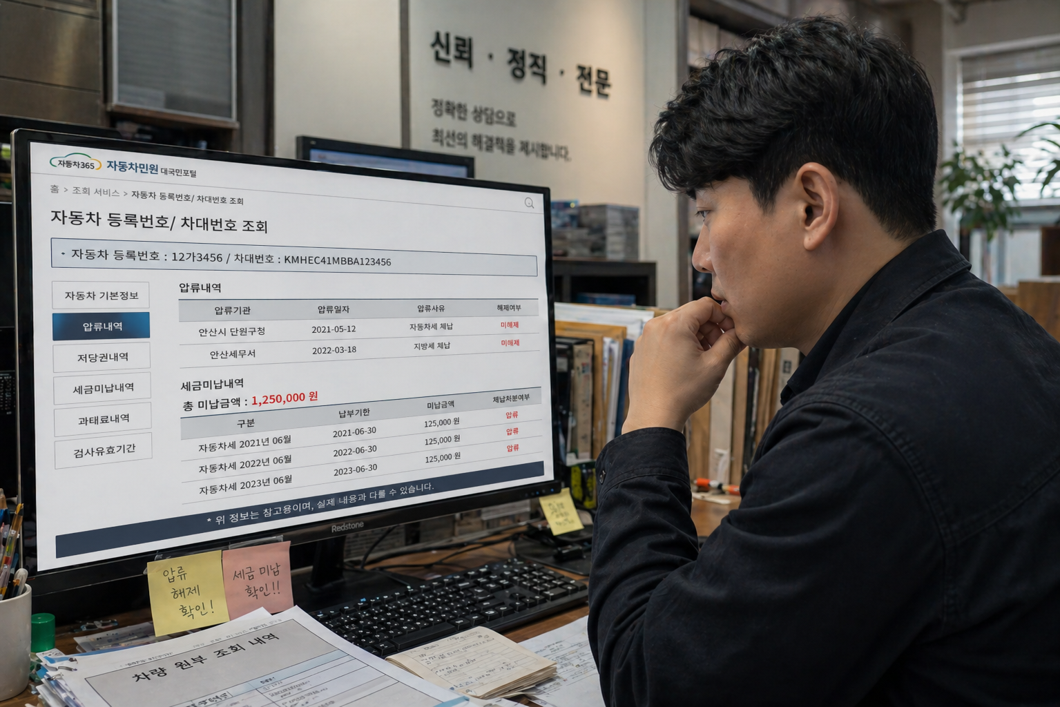저당과 압류 상태에 따라 진행 여부가 달라지기 때문에 차량번호로 원부조회 확인이 반드시 필요하다.