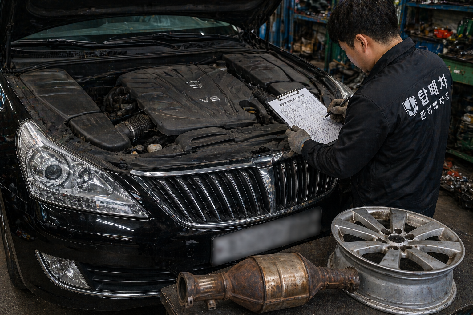에쿠스 2010년식 폐차비는 단순히 연식만 보고 정해지지 않는다. 차량 무게, 알루미늄 휠 여부, 촉매 상태, 엔진과 미션의 재활용 가능성 등이 함께 반영된다. 에쿠스는 대형 세단이라 일반 소형차보다 차체 중량이 큰 편이다.