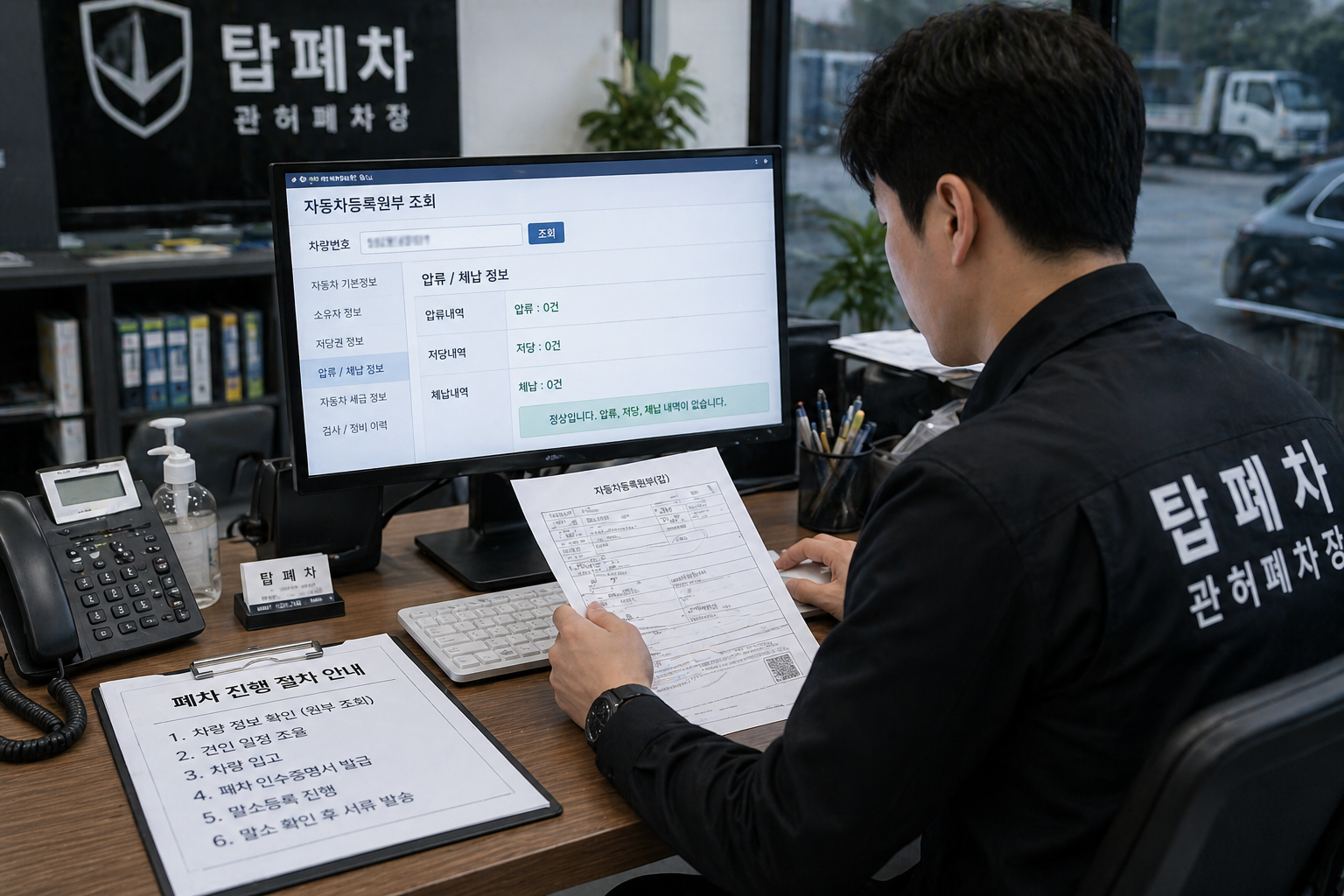 반대로 압류나 저당이 남아 있다면 일반폐차가 아닌 차령초과말소, 즉 압류폐차 가능 여부를 따로 확인해야 한다. 그래서 상담 전에는 차량번호로 원부조회를 먼저 하는 것이 중요하다. 겉으로 멀쩡한 차량도 원부상 문제가 있으면 폐차 방식이 달라진다.