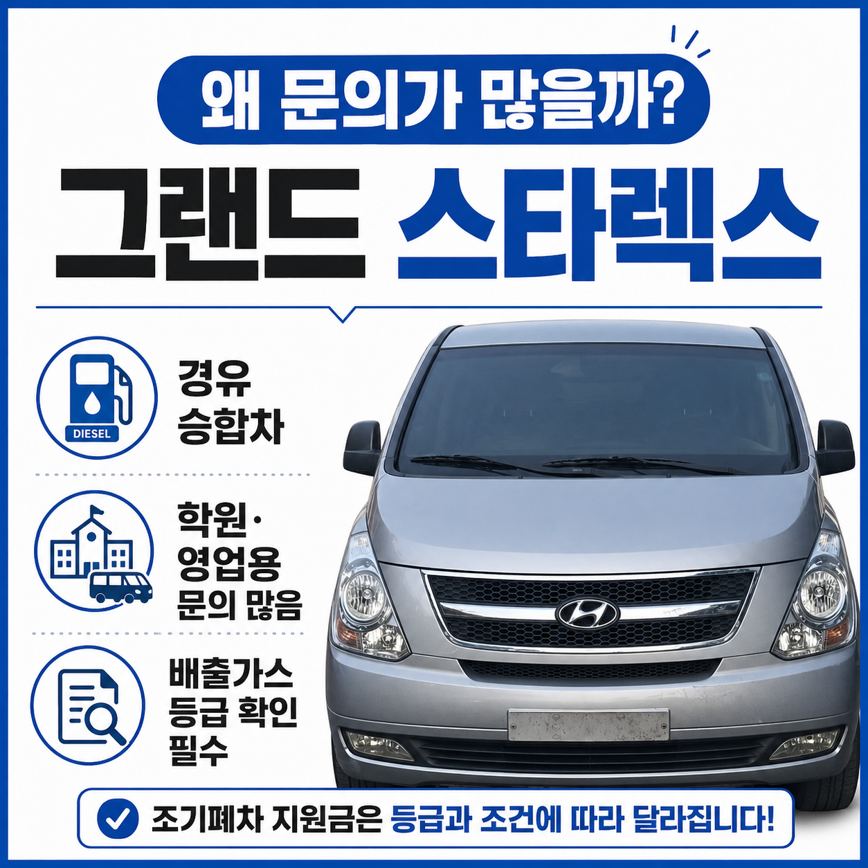 특히 그랜드 스타렉스는 경유 차량 비중이 높기 때문에 조기폐차 문의가 많지만, 반드시 배출가스 등급 확인이 먼저입니다.